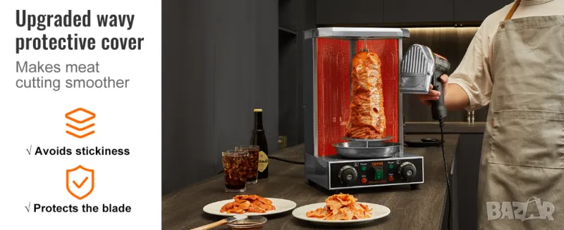 Ножът за турски кебап VEVOR е идеален за нарязване на различни видове месо. Неговата гъвкавост го прави ценен инструмент в търговските кухни за нарязване на агнешко, говеждо или пилешко месо. Можете лесно да го използвате за различни видове месо. Тази гъвкавост се простира отвъд традиционната шаурма. Можете да го използвате за гирос, такос и други. Дизайнът на ножа осигурява прецизно и равномерно нарязване. Тези неща го правят идеален за ястия, които изискват равномерни разфасовки на месото. Възможността за работа с различни видове месо прави тази машина важно допълнение за всеки ресторант или оператор на сергии за храна. Независимо дали сте собственик на ресторант или управлявате щандове за храна, търговският гиросекатор VEVOR отговаря на вашите нужди. Ние имаме инструмент „всичко в едно“, който опростява задачите ви за приготвяне на месо.