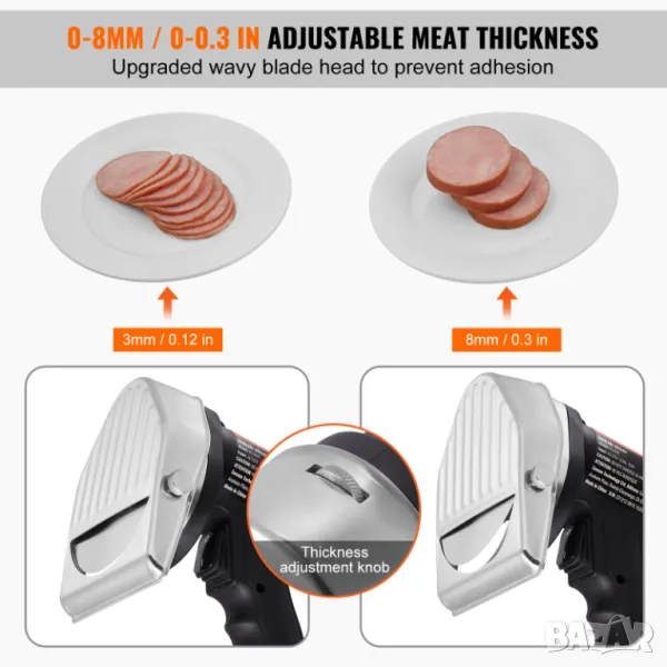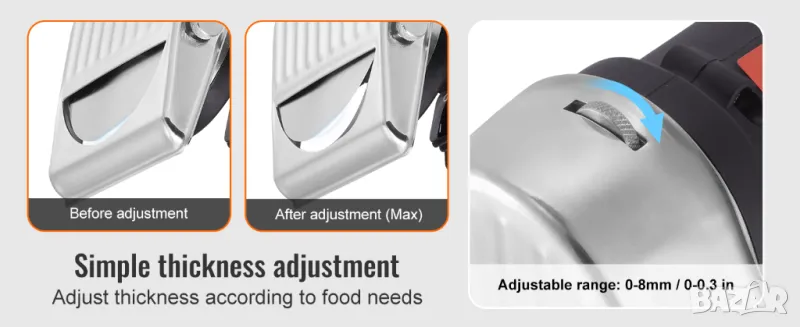 Месорезачката с регулируема дебелина VEVOR предлага прецизно рязане с регулируема дебелина. Функцията за регулиране ви позволява да зададете дебелината от 0 до 8 мм, като гарантирате, че ще получите точния размер на резена, от който се нуждаете. Независимо дали предпочитате тънки или дебели резени, този нож е добър избор. Неговата прецизност е идеална за професионални кухни. Консистенцията, която осигурява, е безценна. Това го прави предпочитан избор както за готвачи, така и за кулинарни майстори. Функцията за регулиране добавя гъвкавост към вашите задачи. Можете лесно да превключвате между различни размери на резените. Така че, бъдете сигурни, че тази гъвкавост го прави професионален инструмент, идеален за постигане на равномерни и прецизни резени месо.