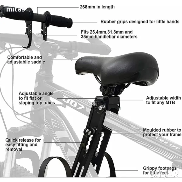Столчето е проектирано за безопасно и удобно возене на деца от 2 до 5 години. Монтирането на седлото в предната част на велосипеда осигурява на детето отлична гледка и взаимодействие с водача. Ергономичният дизайн и висококачествените материали гарантират безопасност и комфорт по време на возенето. Вашето дете ще се наслаждава на природата и изследването заедно с вас