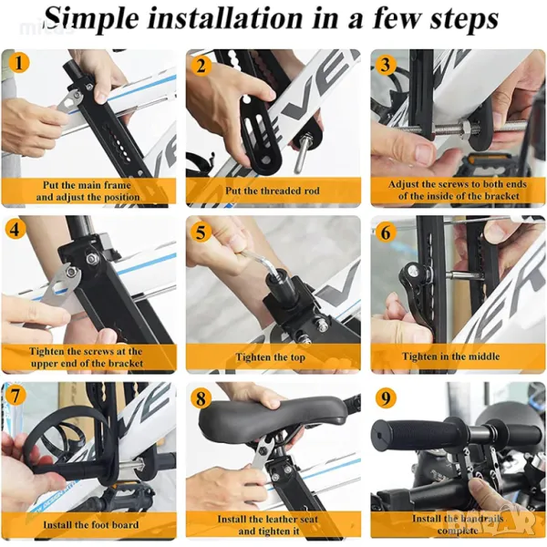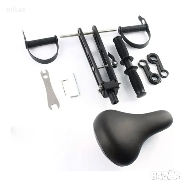 Монтирането на седалката е лесно и не изисква допълнителни инструменти, тъй като всичко необходимо получавате в комплекта. Седалката се закрепва за рамката на велосипеда при кормилото, държачите за ръце и крака се монтират с предоставения ключ. Комплектът включва шестограм и инструкции за монтаж. Така можете бързо и без проблеми да подготвите велосипеда си за нови приключения.