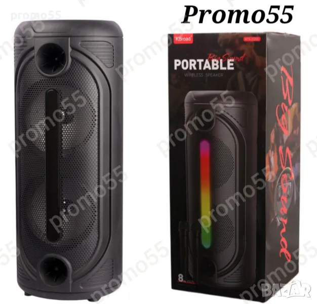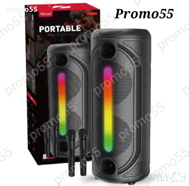 Нов Модел Караоке Тонколона KTS-2086, 2х 8” инча басов високоговорител, с вградена акумулаторна батерия, BLUETOOTH, МP3 плеър от SD карта или флашка, два безжични микрофона за караоке, дистанционно и RGB светлинни ефекти.