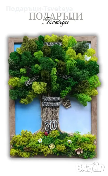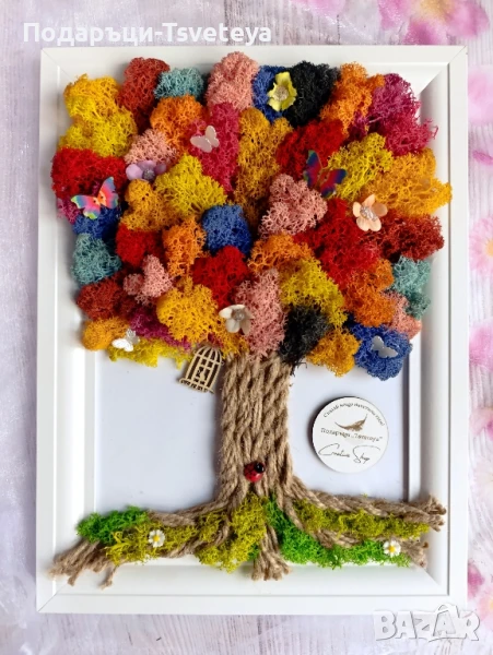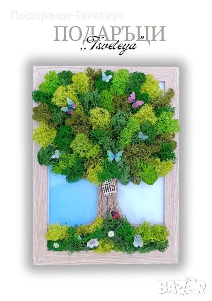 Поднесете незабравим подарък за специален повод с уникалната ръчно изработена картина „Дървото на живота“, изработена с много внимание и любов от естествен мъх и декоративни елементи.