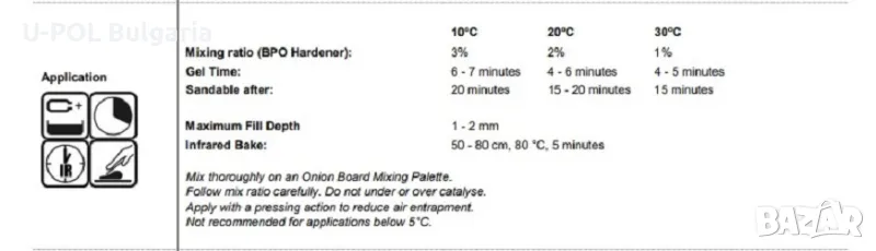 Dolphin Glaze – Филер е многофункционален и има превъзходна адхезия към всички горепосочени основи. За най-добри резултати добрата подготовка е от съществено значение. Почистете и обезмаслете, като премахнете мръсотия, масло, грес и восък, като използвате почистващи разтвори като нашия обезмаслител – напълно съвместим с всички продукти на U-POL. Шлайфайте с шкурка / P180-220/. Почистете отново, подсушете и обезмаслете изтърканата основа, готова за нанасяне.