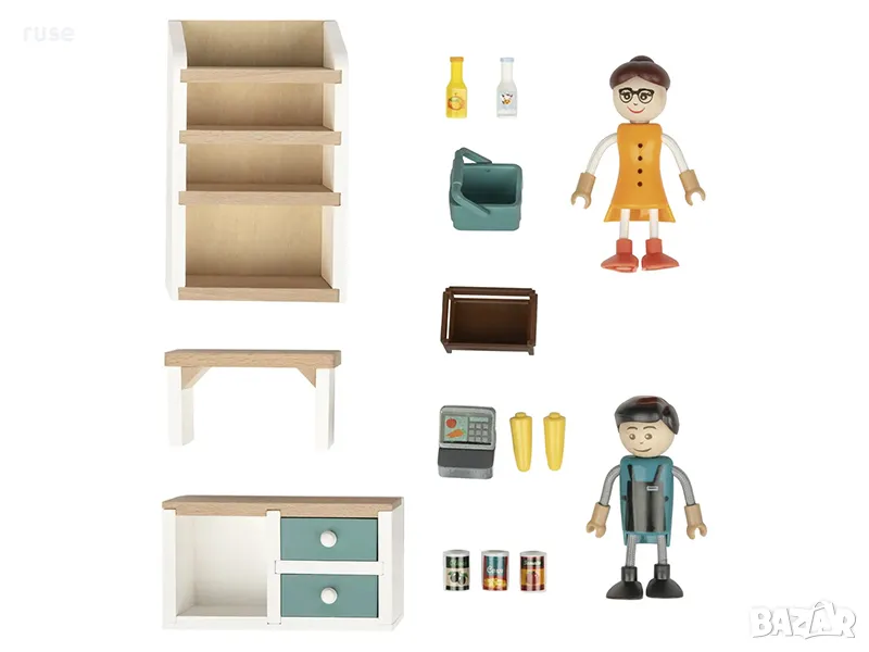 - Аксесоари: 1х щанд с 1х каса, 1х щанд с чекмедже и 2х бутилки с напитки, 1х рафт с 5х хранителни продукта и 1х дървена кутия, 2х кукли, 1х кошница за пазаруване