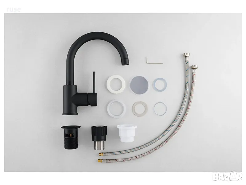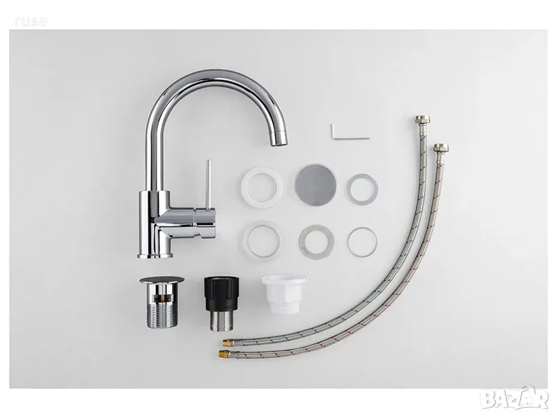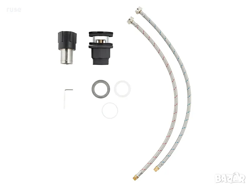 - Съдържание на опаковката: смесител, гъвкави меки връзки, тръба с резба, пластмасова гайка, уплътнение, пластмасова подложна шайба, шестограмен ключ