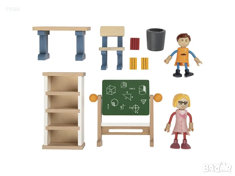 - Аксесоари: 1 х дъска, 1 х маса с 1 х стол, 1 х рафт с 3 х книги, 1 х кошче за хартия, 2 х кукли
