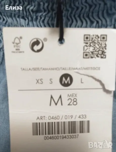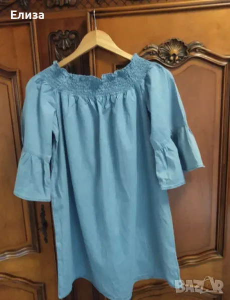 Дамска рокля/туника Zara. Номер 28/ М. Цвят: светлосин. Материал: 100% памук (деним). Гръдна обиколка: 104 см. Дължина: 76 см. Дължина на ръкав: 36 см.