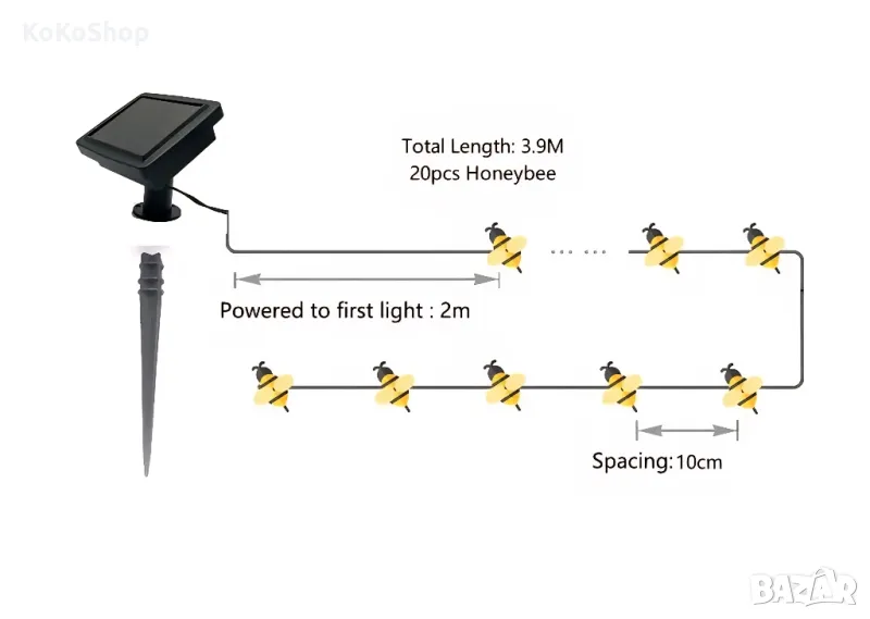 Соларен гирлянд с пчелички – 20 LED лампички за декорация на градина и балкон