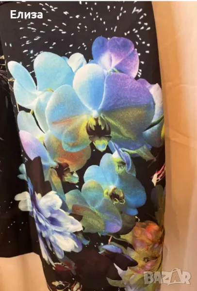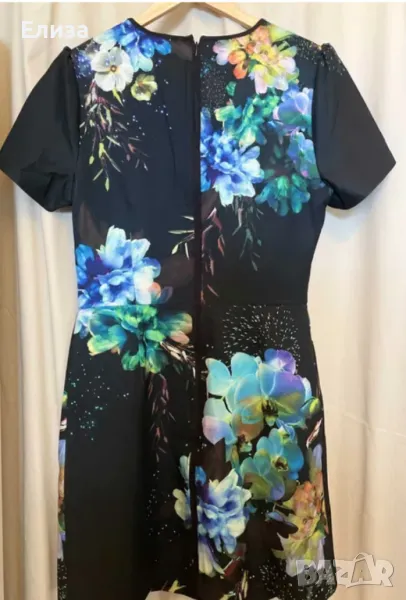 Дамска рокля, изработена от полиестер (88%) и еластан (12%). Цвят: многоцветен(черна основа на цветя). Гръдна обиколка 94 см. Талия 82 см. Ханш 102 см. Дължина от рамо 94 см. Дължина ръкав 21 см. Закопчаване с цип на гърба. Нов продукт с етикет.