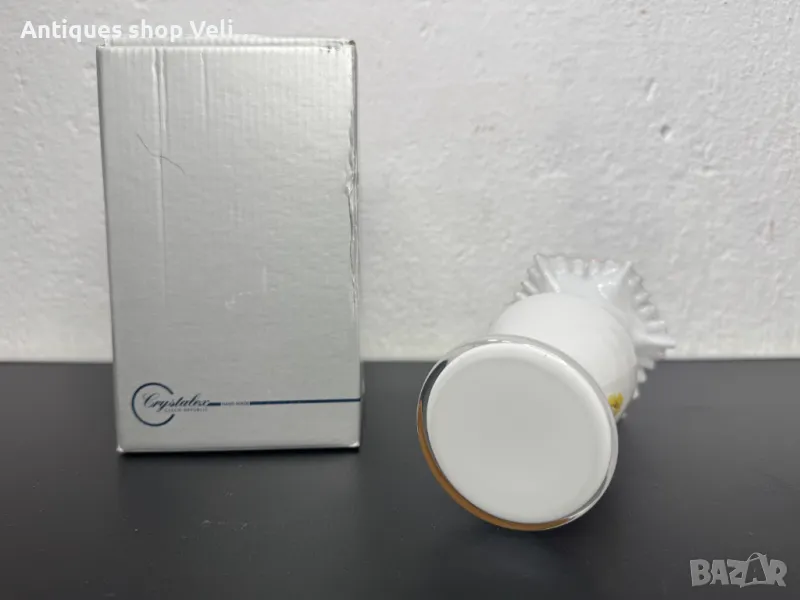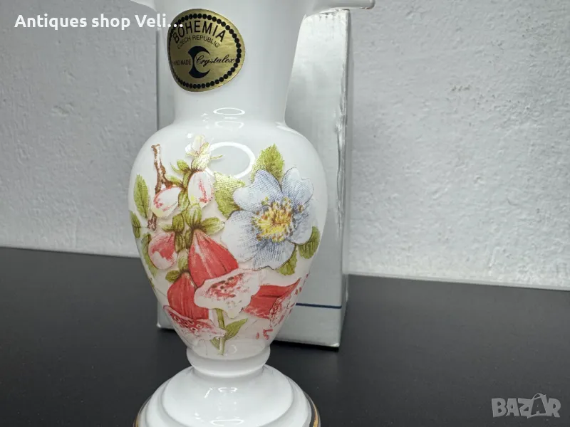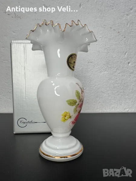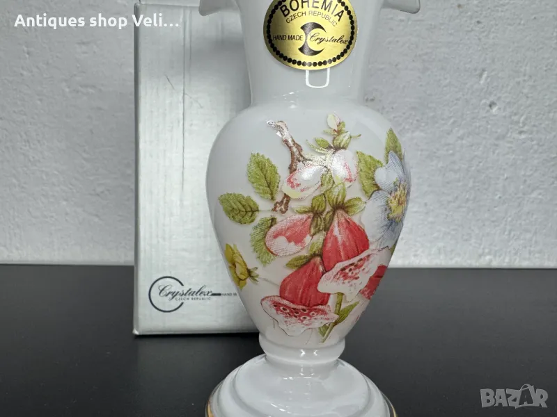 Ръчно изработрена и рисувана ваза бохемско стъкло. Перфектно състояние с оригиналната кутия.Идеална за подарък. Предлагаме доставка с Еконт и лично предаване за градовете Велико Търново, Русе и Сливен!