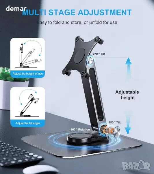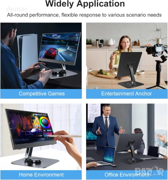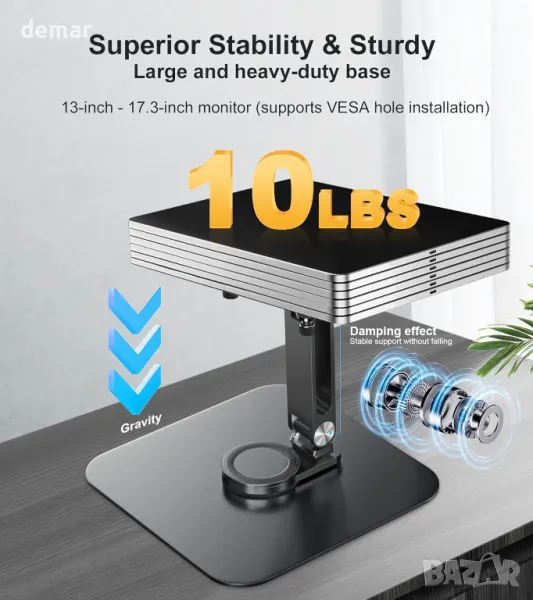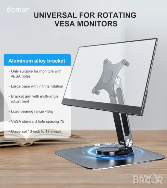 Тази регулируема стойка за настолен монитор не изисква монтаж и е съвместима с повечето плоски монитори от 7 до 17,3 инча с отвори VESA 75x75 мм и винтове M4. Тя разполага със здрава, свободно стояща алуминиева основа с неплъзгащи се подложки, издържа до 10 паунда (4,5 кг) и включва винтове против изгубване, които остават здраво закрепени. Въртящата се на 360° основа позволява лесно регулиране на ъгъла без повдигане, а ергономичният дизайн спомага за подобряване на стойката при продължителна употреба. Мониторите под 17,3 инча могат да бъдат настроени в портретна или пейзажна ориентация, а основата осигурява стабилност при всякакъв наклон.