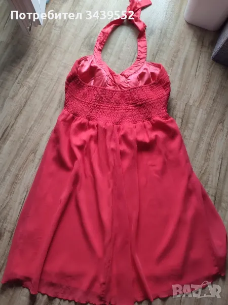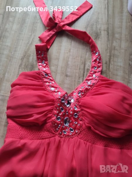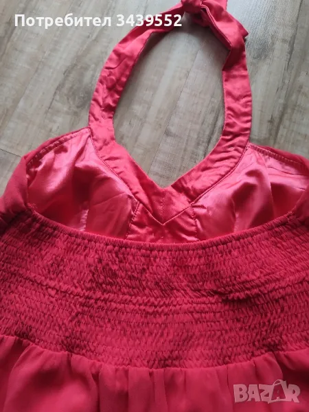 Нежна рокля в цвят корал, изработена от сатен и шифон. Обшита с декоративни камъни по деколтето и с вградени подплънки за бюста. С гол гръб и презрамки зад врата. Обличана е веднъж за няколко часа за повод. Без никакви забележки! Обиколка под бюста-78см., но е с ластик и реално е за по голяма обиколка. Дължина под ластика на бюста- 58см. Размер UK -14.