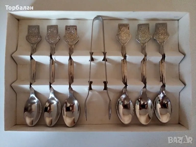 Състои се от от щипка за бучки захар и 6 броя лъжички за кафе