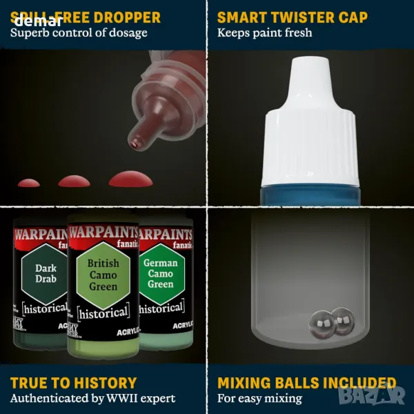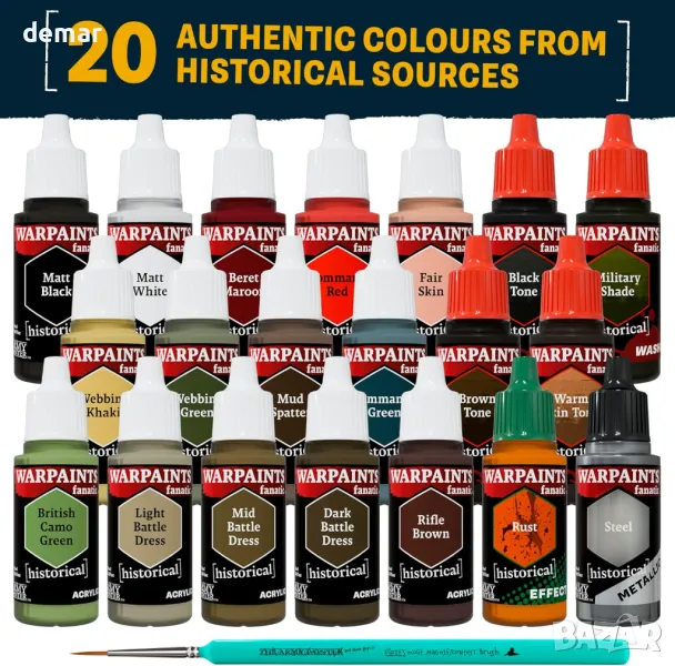 Този комплект бои за Втората световна война включва 20 внимателно подбрани цвята – 14 акрилни, 4 измивания, 1 ефект и 1 металик – проектирани с експертен принос, за да представят автентично униформите и екипировката на британските въоръжени сили. Комплектът се предлага и с четка за детайли, което го прави идеален за точно рисуване на исторически миниатюри.