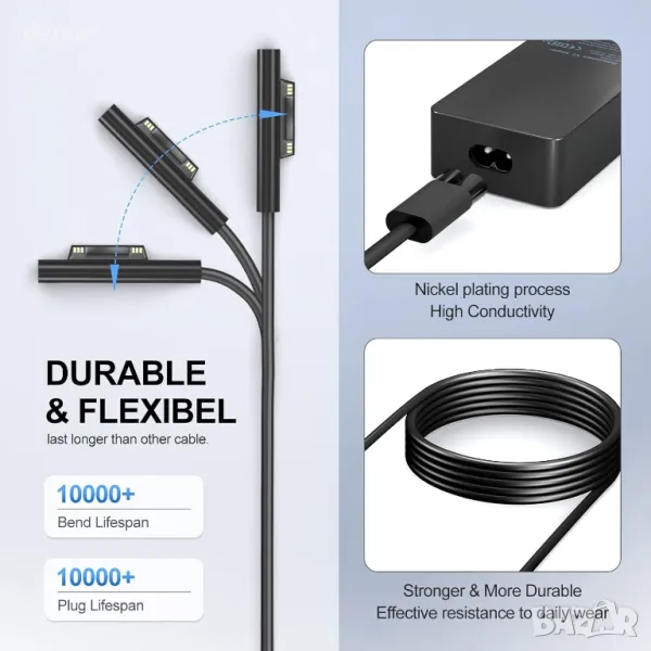 Подходящо за 102W 15V 6.33A зарядно; 65W 15V 4A зарядно; 44W 15V 2.58A зарядно; 39W 15V 2.6A зарядно; 36W 12V 2.58A зарядно; 24W 15V 1.6A зарядно. Зарядно устройство Microsoft Surface за Surface 1735 1736 1796 1800 1873 1625 1631 1782 1769 1703 1706 1724