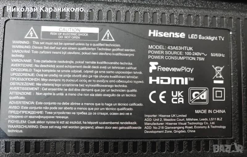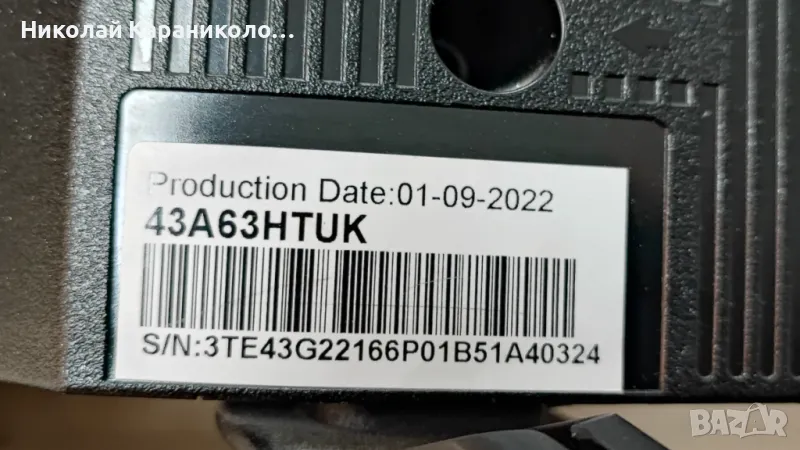 Продавам тв HISENSE 43A63HTUK за части по причина-счупена матрица/HD425Y1U51-T0L1/.Редовни съответно: