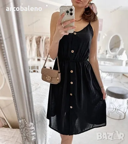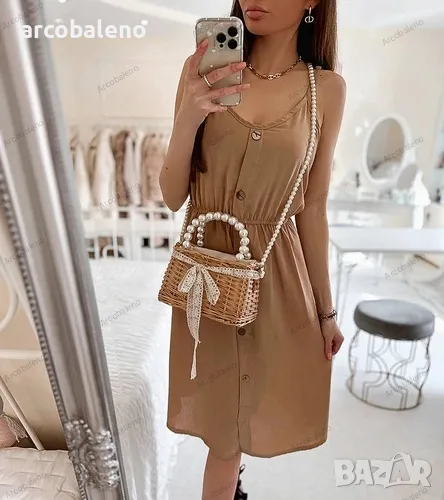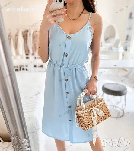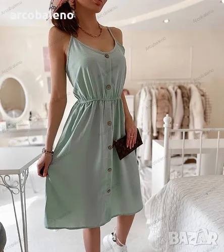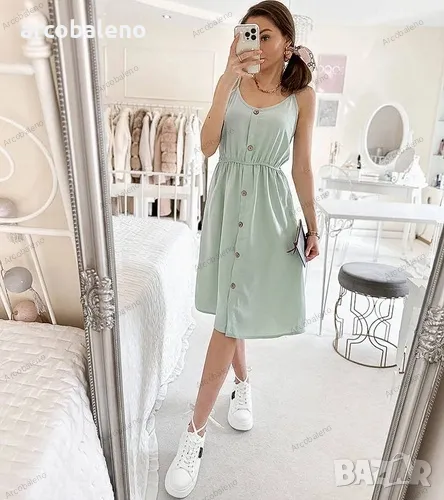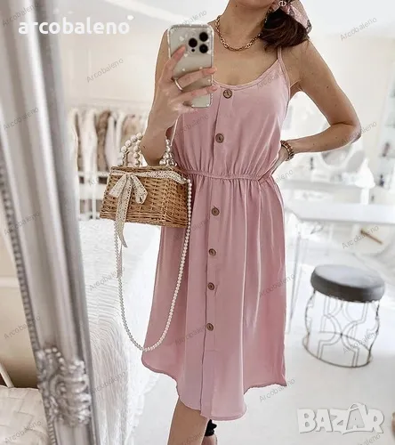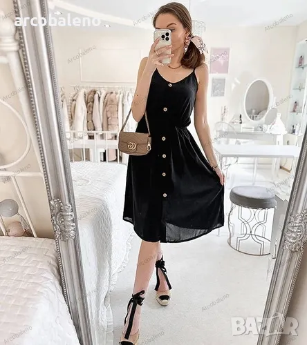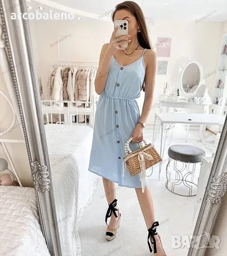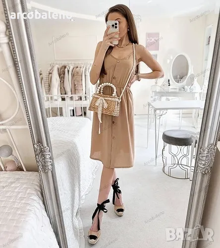 Рокля Aubin с миди дължина, декорирана с копчета отпред. С кръгло деколте, презрамки и еластична талия. Без подплата. Търсите ли ефирна, лятна рокля, в която ще изглеждате зашеметяващо? Моделът Aubin със сигурност ще ви очарова!