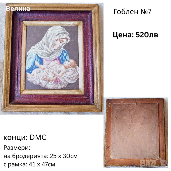 На всеки гоблен е посочена цената и размерите. Като размерите са 2 вида: само на бродираната част и на цялата рамка.