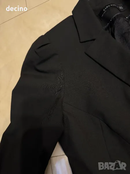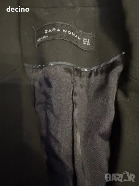Дамско черно сако Zara. Размер S.43 см ширина, 70 см дължина. Няколко пъти е обличано. Без следи от употреба.