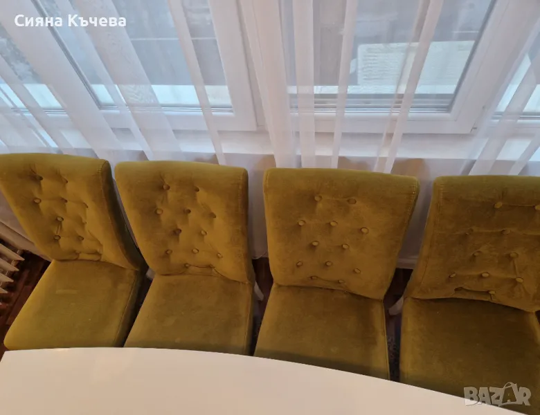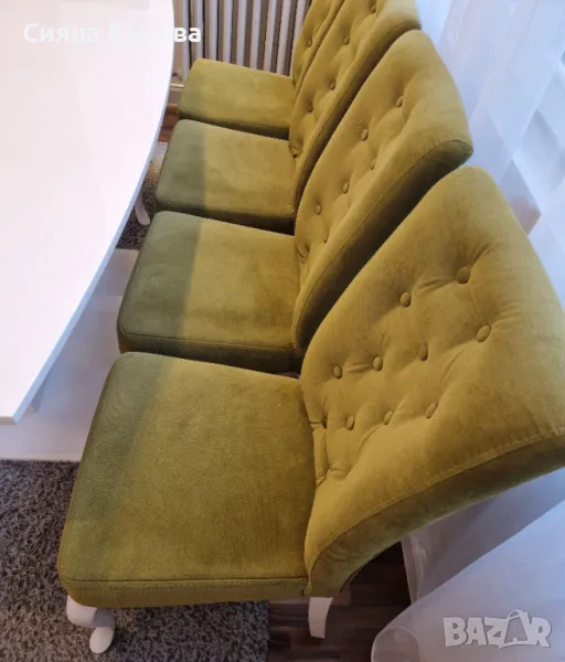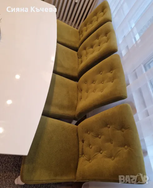Тапицирани трапезни столове от масивна дървесина с бели крака, в зелена дамаска с декоративни копчета. Изключително удобни и комфортни. ( тапицерия-кронос 17) .
