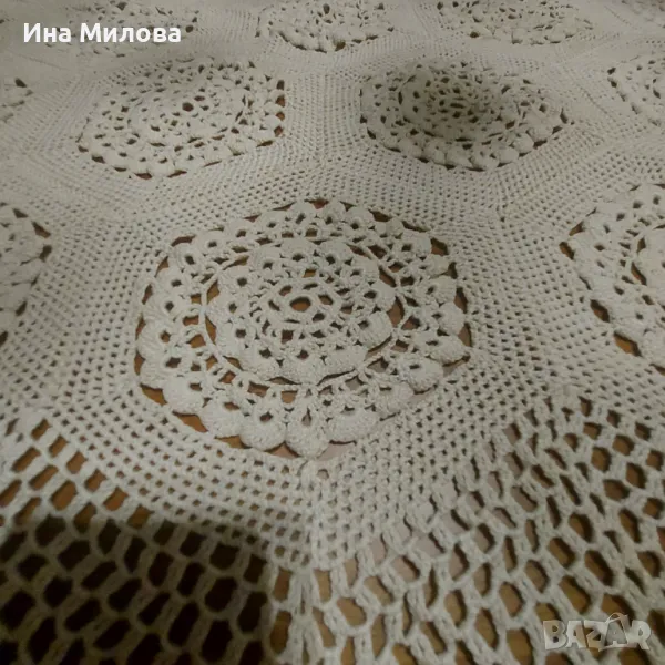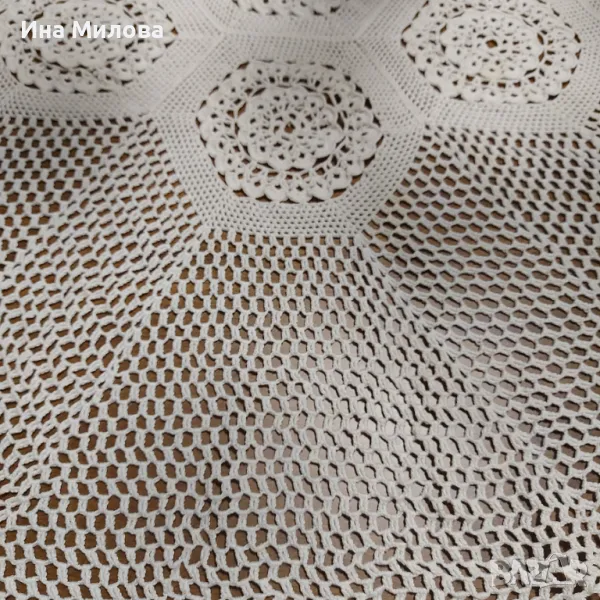 Покривки плетени на 1 кука за кръгла маса диаметър 140см. Налични 3 броя. Едната е прана без забележки, другите не. Цената е за брой