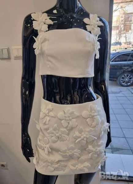 Материя полиестерКомплект от две части Пола и бюстие с 3Д цветя Бяло С,М60лв
