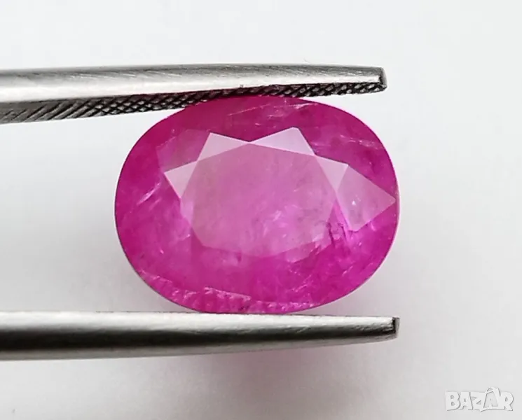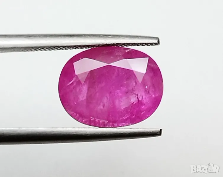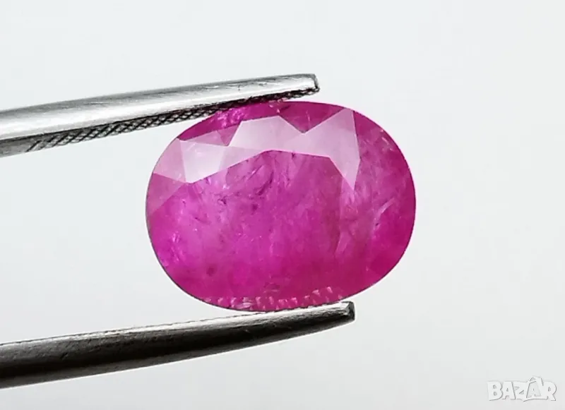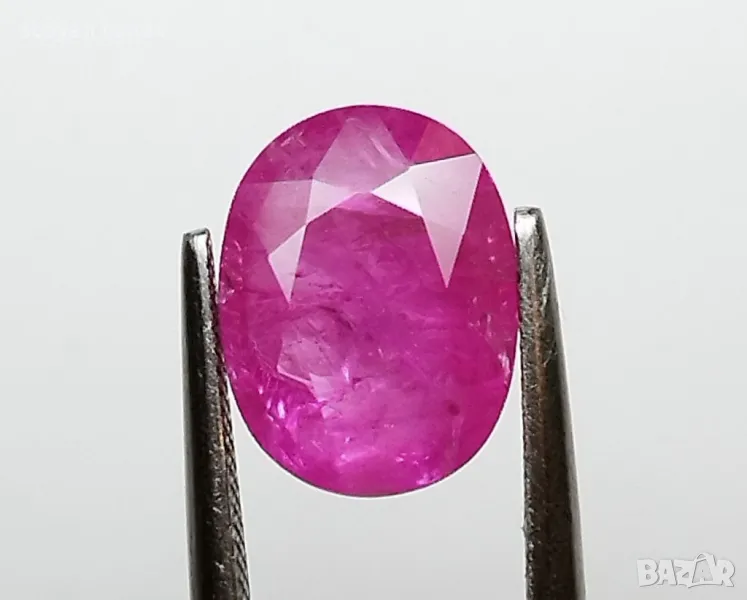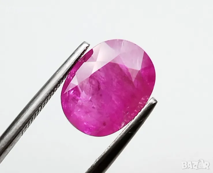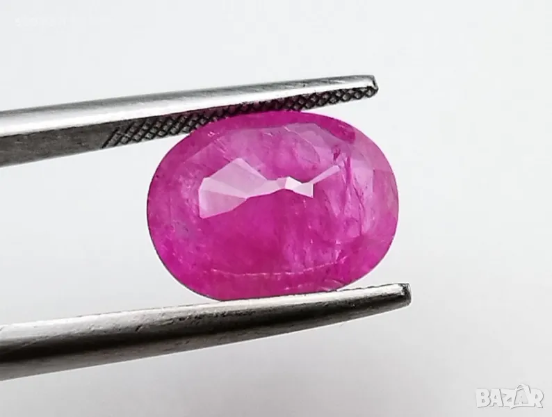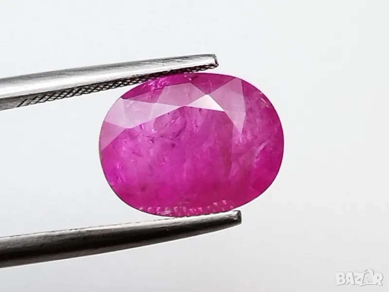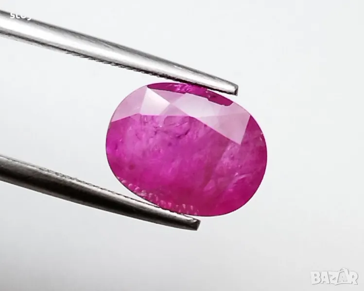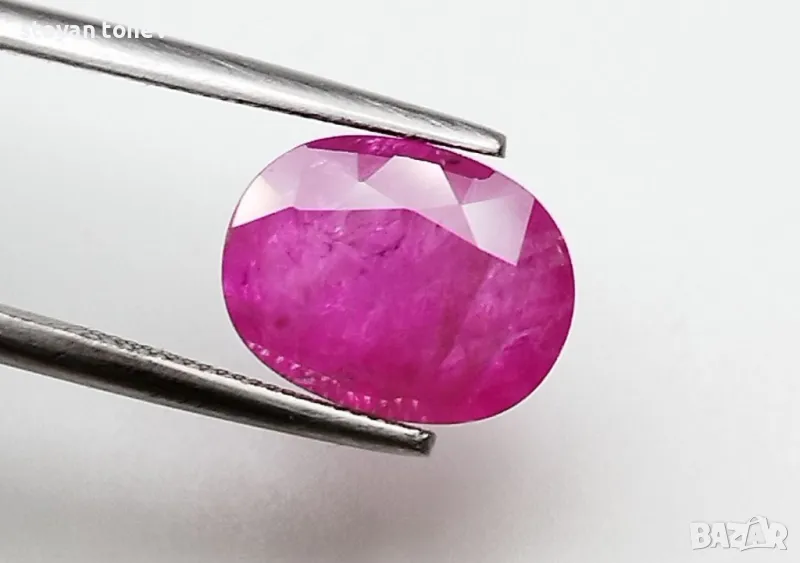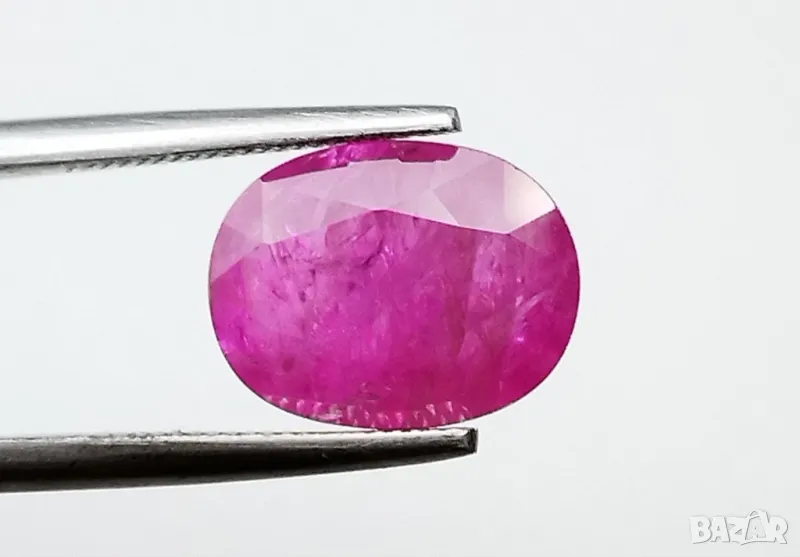 рубин с тегло 2.60кт. и произход Мианмар(Бурма) . Чистота SI1 с равномерно разположени видими включения. Цвета му е лилавеещо червен. Овал с размери: 9.84 x 7.55 x 3.54 mm.