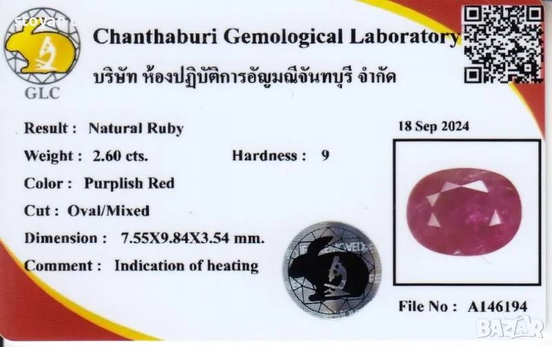 Стандартно нагряван. Сертифициран от GLC Gem Lab с възможност за онлайн проследяване.