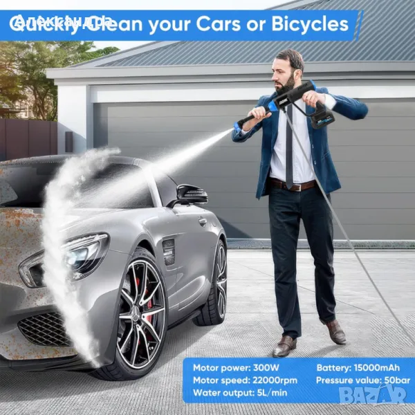 Аксесоари: Литиево-йонна батерия 48V (15000mAh), зарядно устройство, маркуч (10 м), филтър за вода, пръскачка за пяна, дюза с регулируема струя, удължителна тръба.