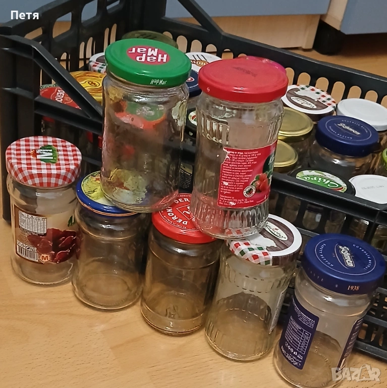 Сн. 1- 2 - Продавам буркани с винтова капачка, еднократно използвани, вместимост - от 580 до 720 мл. Количество - 30 броя. Цена - 0,20 евро на брой.