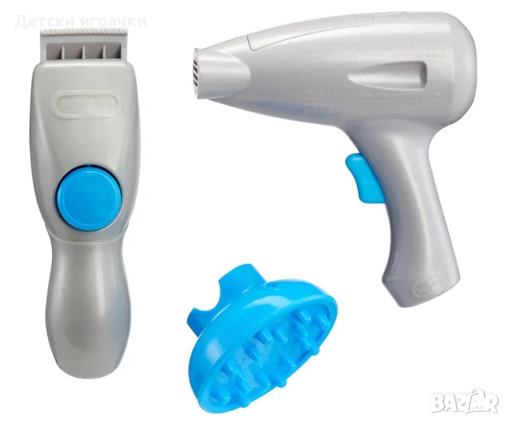 Този комплект за ролеви игри в салона включва работещ сешоар, бръмчаща машинка за подстригване, 2 удължения с щипки за коса, 2 маши, дифузер, маша, брада за игра, ножица, безопасно за деца огледало, гребен, четка, четка за масаж на скалпа, бръснарско наметало, стилистична престилка и други;