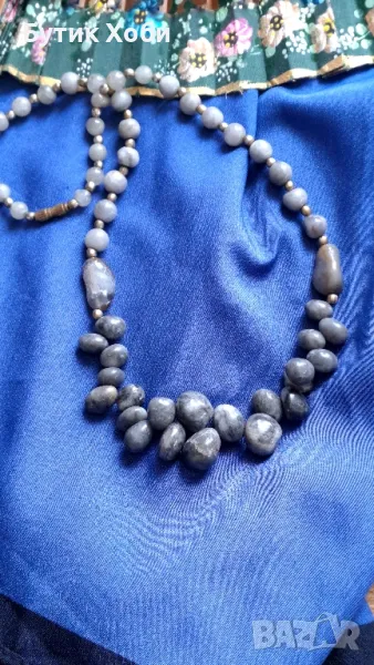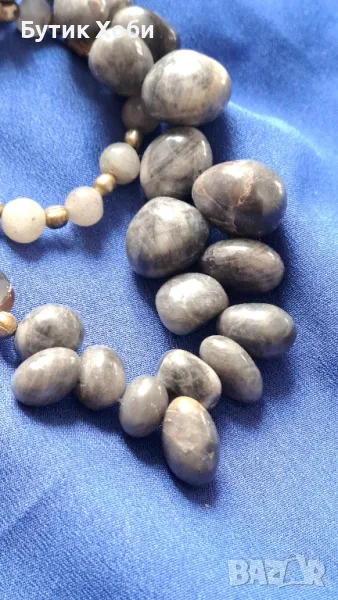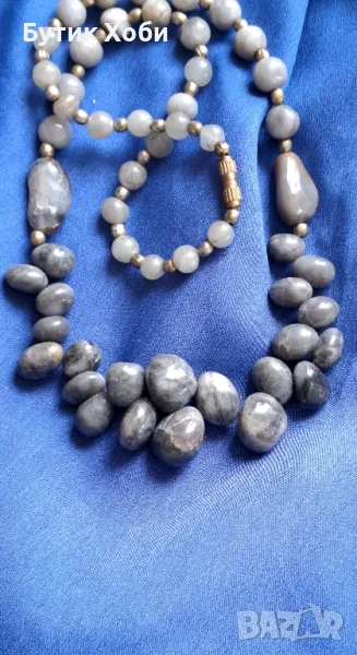 Колие от естествен сив ахат с интересна форма, напомняща морските камъчета. Сивият ахат помага за защита на истината и за разрешаване на конфликтни ситуации. Дължина- 46см, елемент - 1,5÷0,4см.
