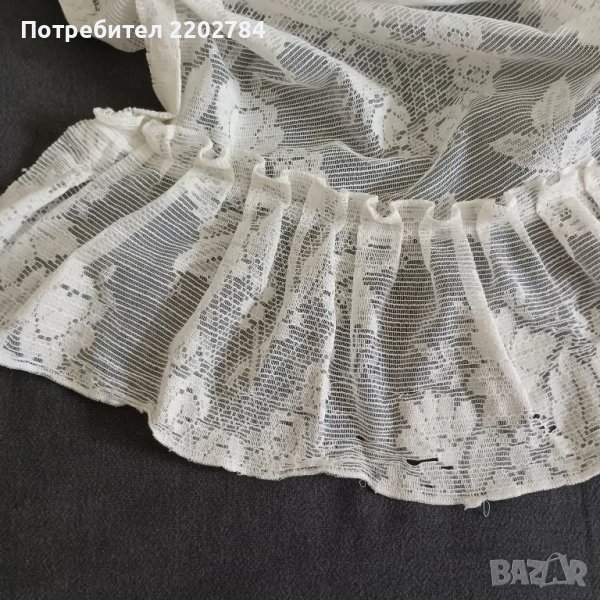 Третото е бяло перде с гъсти варбали в долния край.Пердето е по дълго в средата и по късо в двата края(като дъга) С перделик в горната част без копчета.Много пищно стои заради силния набор на плат.Има минимална забележка - нишка е прекъсната на две места в края на върбалата(при поставяне не се забелязва) Снимано на последната снимка.Ширина в горната част 76см, ширина в долната част 210см, дължина в средата 120см,дължина в двата края 100см.