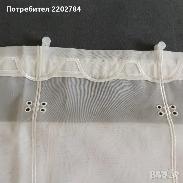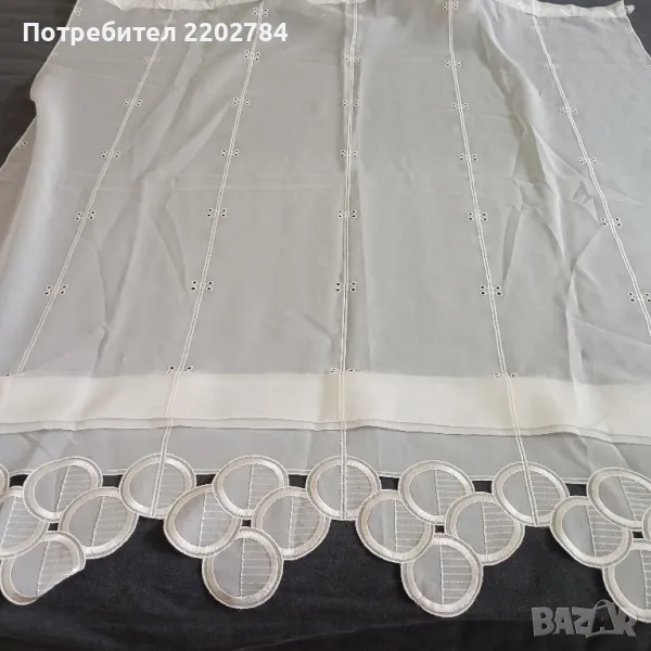Следва перде в много светло екрю.Воал с прекрасни елементи в долната и горната част.С перделик и копчета.Ширина 95см, дължина 110см.Има две плисета,които са прихванати в задната част с пластмасови кукички.Ако се махнат се увеличава дължината с 20см.Без забележки.