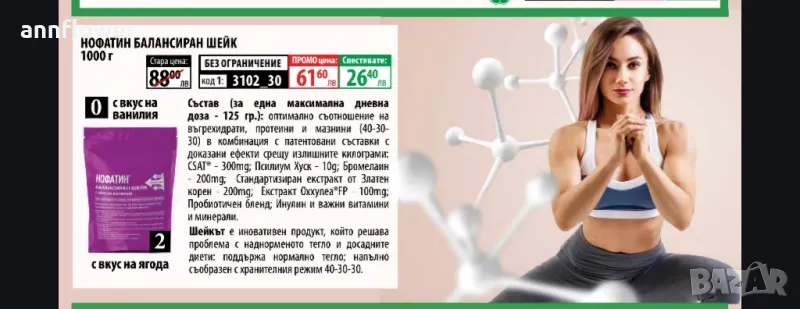 Нофатин балансиран шейк е формула с оптимално енергийно съотношение на въглехидрати, протеини и мазнини (40-30-30). Това означава, че при всяка доза 40% от калориите, които приемате са от висококачествени въглехидрати, 30% са от висококачествени протеини и 30% са от висококачествени мазнини. Предлага се в три превъзходни вкуса – ванилия, шоколад и ягода. Нофатин Балансиран шейк е революционен продукт, който съчетава действието на високобелтъчна пробиотична храна, патентовани съставки за редукция на теглото, витамини, минерали и антиоксиданти.