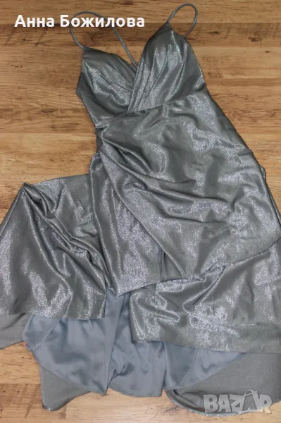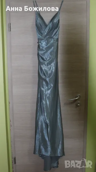 БГ: Роклята е чисто нова с етикет - дълга; сатенена/ сияеща; синьо-зелена до сива с приятен блясък; сърцевидно деколте и кръстосани презрамни на гърба. Закопчава се със "скрит" цип. Изработена е от здрава на усет материя, която е разтеглива и се оформя по тялото на дамата - на етикета пише, че е размер S (аз самата съм S и ми пасва идеално), но според мен спокойно може да се носи и от човек с размер M.