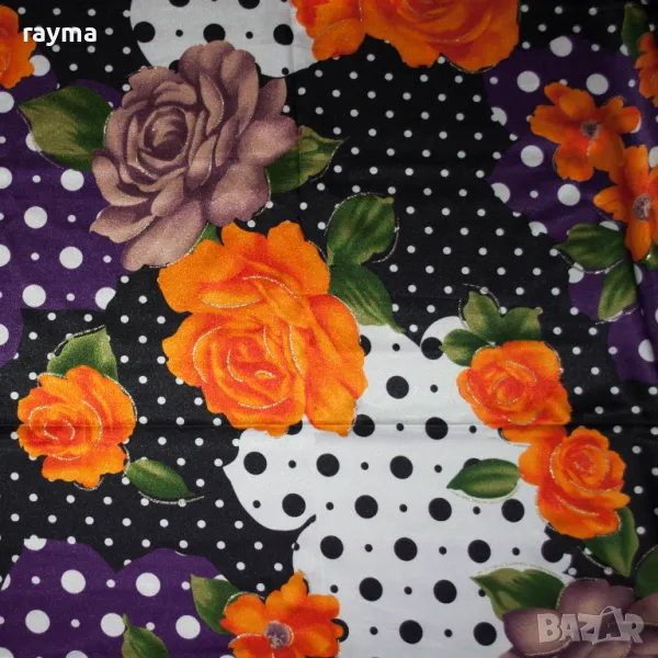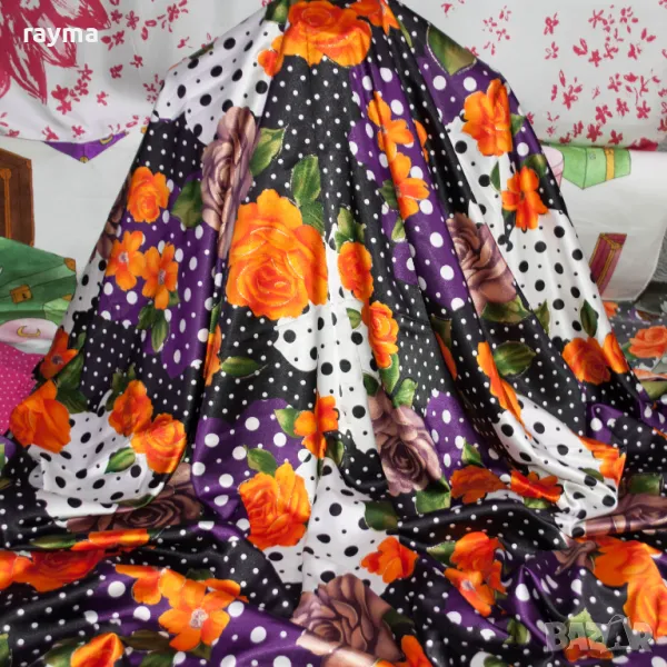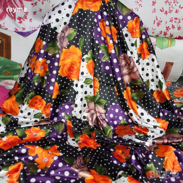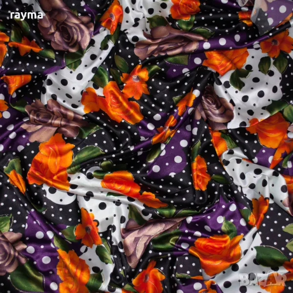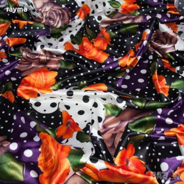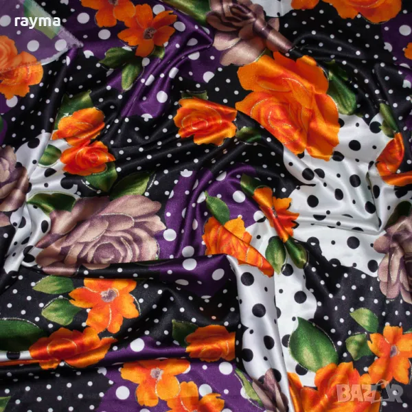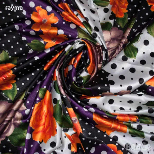 Италиански еластичен сатен принт точки и цветя → Обява 50431475