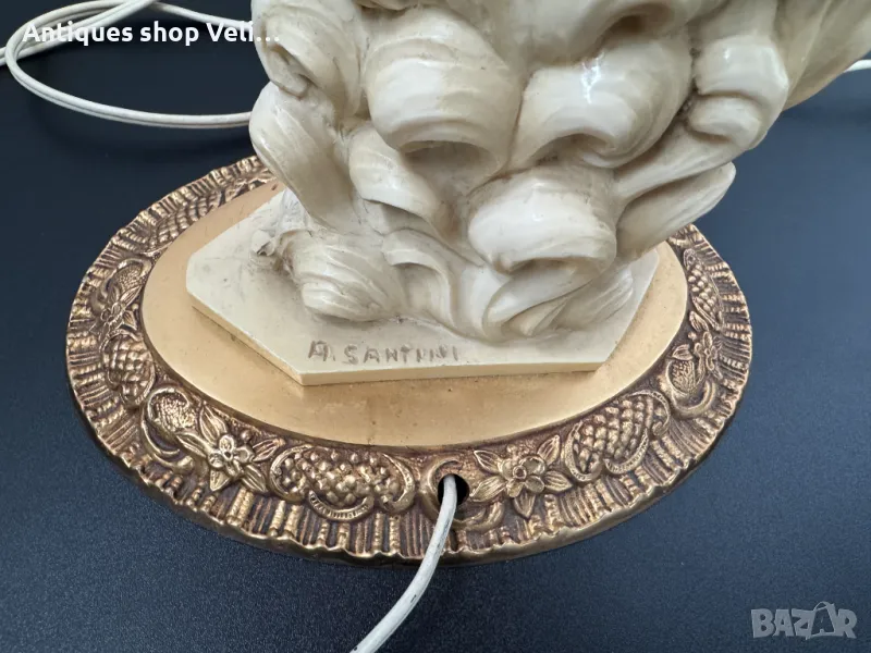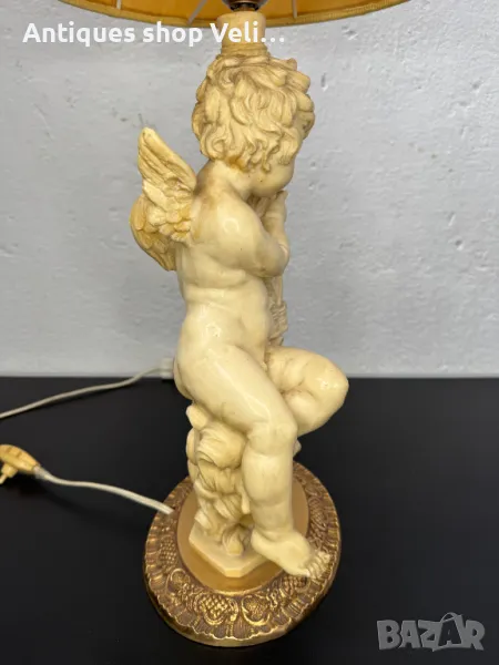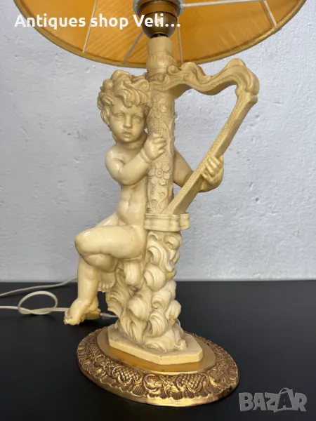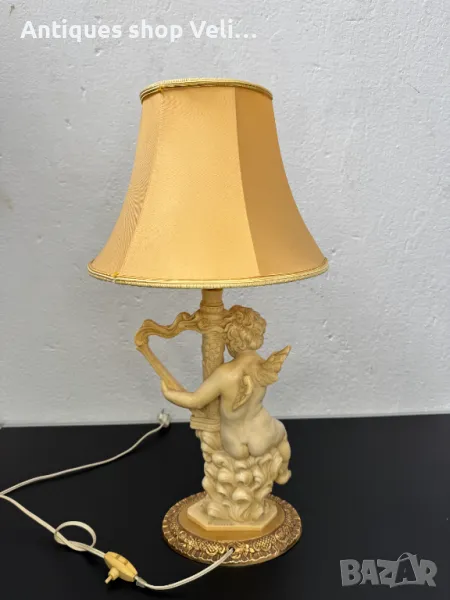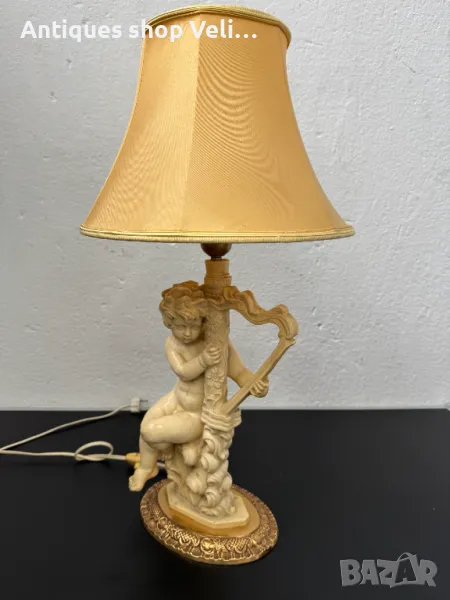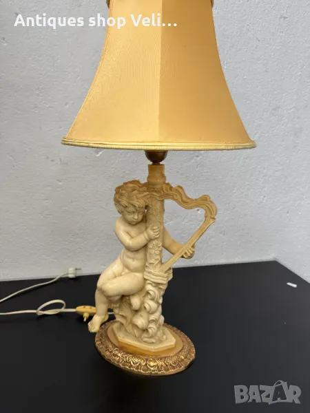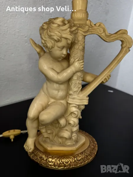 Красива авторска италианска настолна лампа, изобразяваша ангел или хервим седнал на облак и свирещ на арфа върху масивна бронзова основа. Много добро състояние. Предлагаме доставка с Еконт и лично предаване за градовете Велико Търново, Русе и Сливен! Височина-59см.