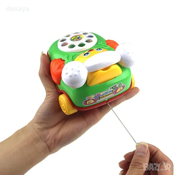 Телефончето има вградено въженце отзад – просто го дръпнете, пуснете го и играчката ще се задвижи напред, съпроводена със забавен звън, точно като истински телефон!