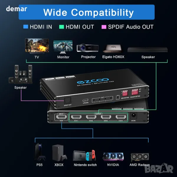 Този 1x4 HDMI 2.1 сплитер разпределя един HDMI вход към четири дисплея в огледален режим, поддържайки до 8K@60Hz или 4K@120Hz с VRR, ALLM, HDR10 и Dolby Vision. Включва EDID управление и downscaler за конвертиране от 4K120Hz към 1080P120Hz. Аудиото може да се извлича чрез HDMI, оптичен SPDIF, 3.5 мм или L/R, поддържайки формати от 2CH до 7.1CH, включително Dolby Atmos и DTS:X. Идеален за игрови конзоли и медийни устройства, поддържа едновременно извеждане в множество резолюции. Използвайте само висококачествени HDMI 2.1 кабели под 3 м за оптимална производителност. Забележка: той огледално показва само дисплеи, не поддържа ARC/eARC, разширение на екрана или HDR-към-SDR конвертиране.
