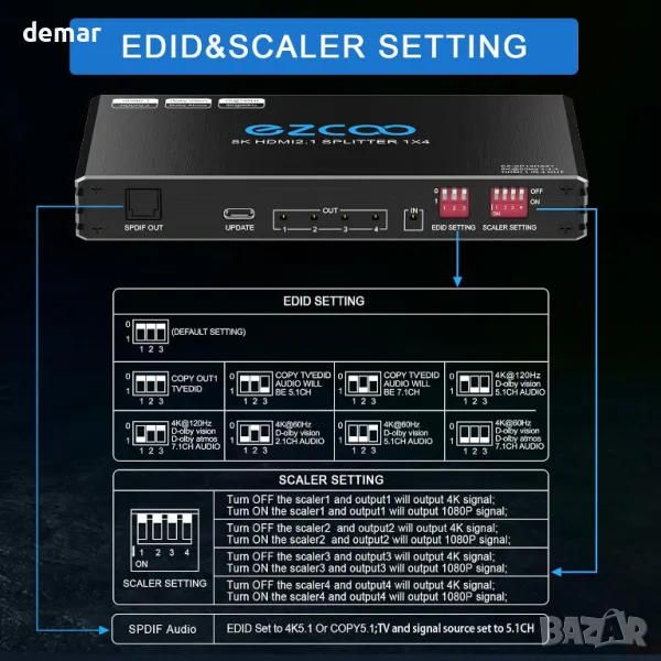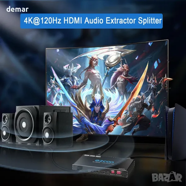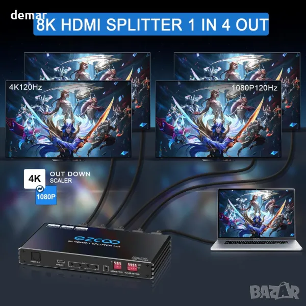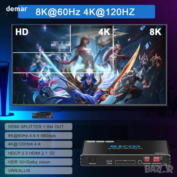 4K 120Hz HDMI 2.1 сплитер 1X4 аудио екстрактор VRR ALLM HDCP2.3 HDR10+ SPDIF