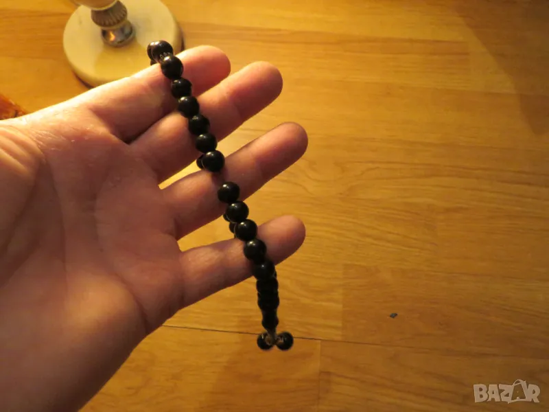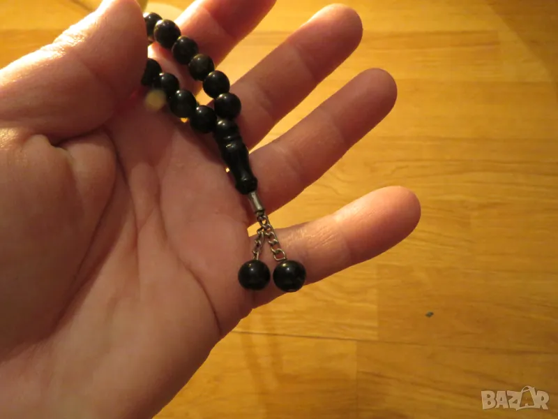 броеница с черни зърна, молитвена броеница с 33 мъниста с който мюсюлманите отброяват повтарящите се молитвени формули и имената на Аллах.
