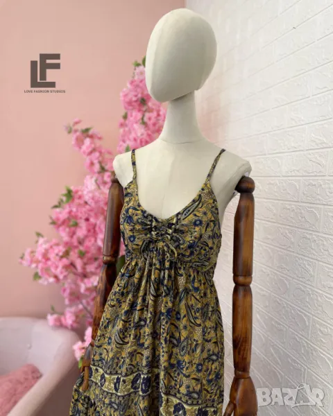 Кройка: Кройката е свободна в горната част и разкроена в долната, с ластик под бюста, коригиращи връзки и презрамки