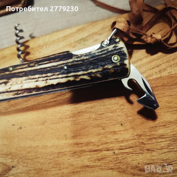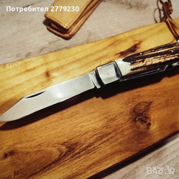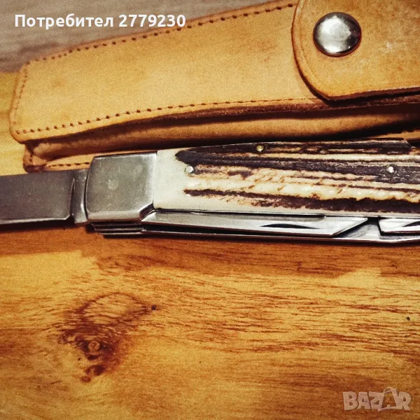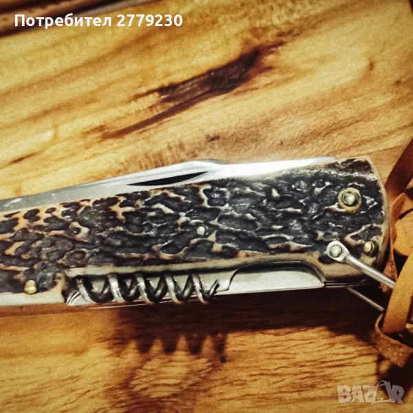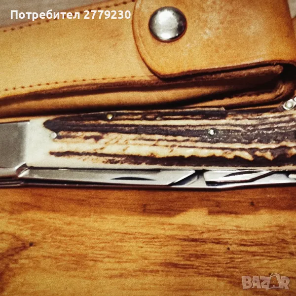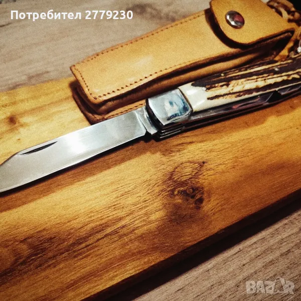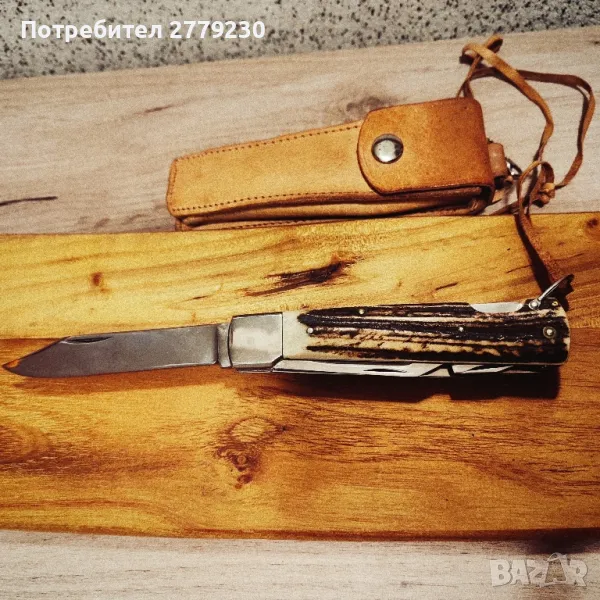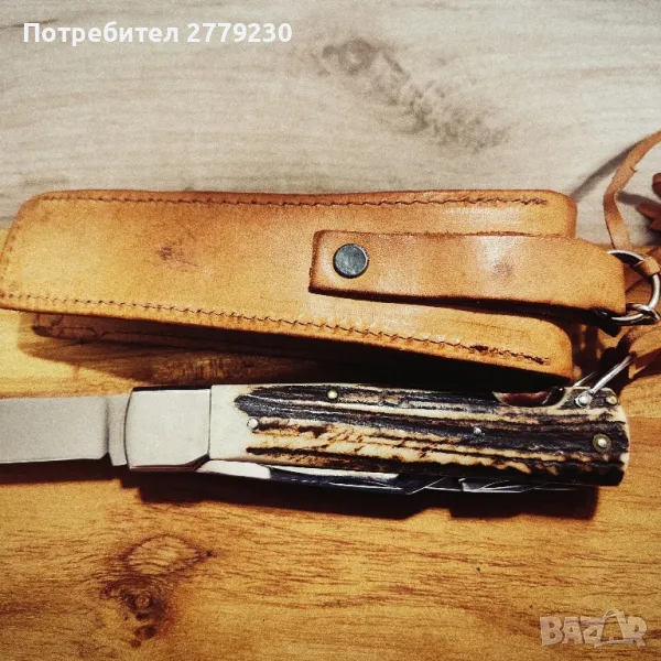Многофункционална ножка ръчна изработка с чирени от еленски рог много масивна и стабилна. Виждат се остриетата. С кожен калъф и за колан има гайка. Нова от колекция. С преглед преди заплащане. Вижте и