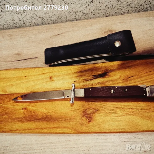 Парашутен полуавтоматичен нож ръчна изработка по поръчка за колекция в П.Денев. Дължина на целия нож 28 см., с острие 12 см. С перфектно работещ механизъм. С кожен калъф към него. С преглед преди заплащане. Договаряне!