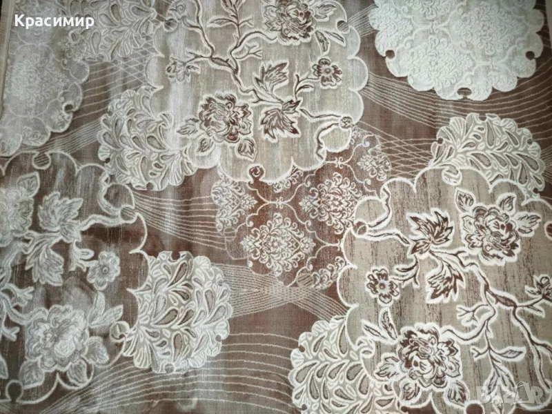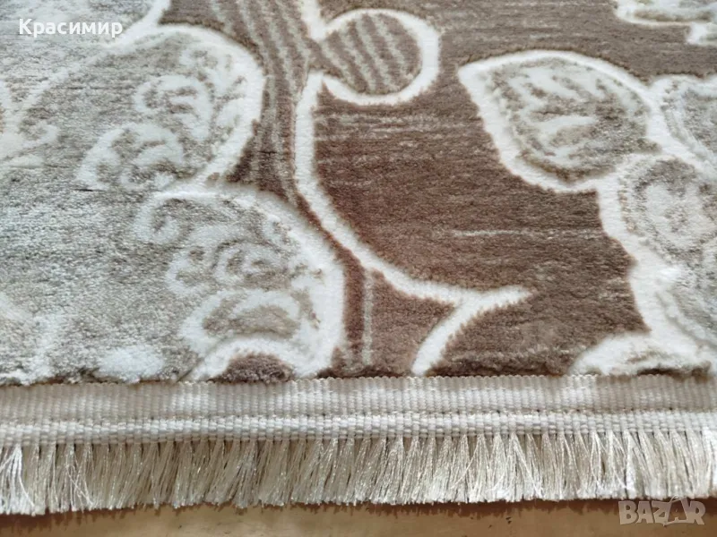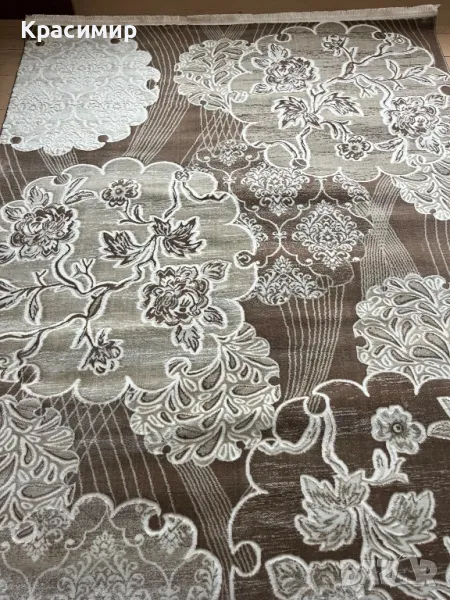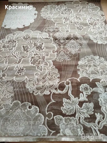 Луксозен килим с елегантен флорален десен. Изключително красив килим в топли, млечни, бежово-кафяви нюанси. Мек на допир и с релефни флорални мотиви, които придават усещане за класа и комфорт. Подходящ за хол, спалня или кабинет. Отлично състояние.