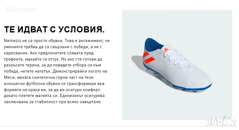 Моделът Nemeziz Messi 19.4 е част от линията, подписана от един от най-добрите футболисти в света - Лионел Меси. Тази комбинация от технологии и страст към футбола ги прави перфектният избор за млади спортисти. Пластмасовите шипове са подходящи за игра на естествена и изкуствена трева, което прави тези обувки универсални и практични.