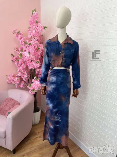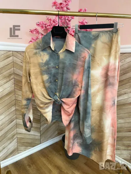 Кройка: Кройката на ризата е свободна, права, тип OVERSIZE. Кройката на полата е слим в горната част (издължаваща) и разкроена в долната, с ластик на кръста, висока талия и цип