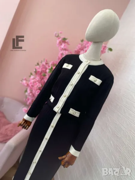 Кройка: Комплект пола и жилетка. Кройката на полата е права, слим с висока талия. Кройката на жилетката е свободна с ефектни перлени копчета