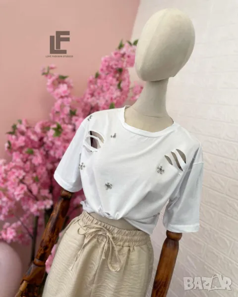 Кройка: Сет от две части. Тениската е свободена, права. Панталонките са с висока талия, ластик в кръста и коригиращи връзки